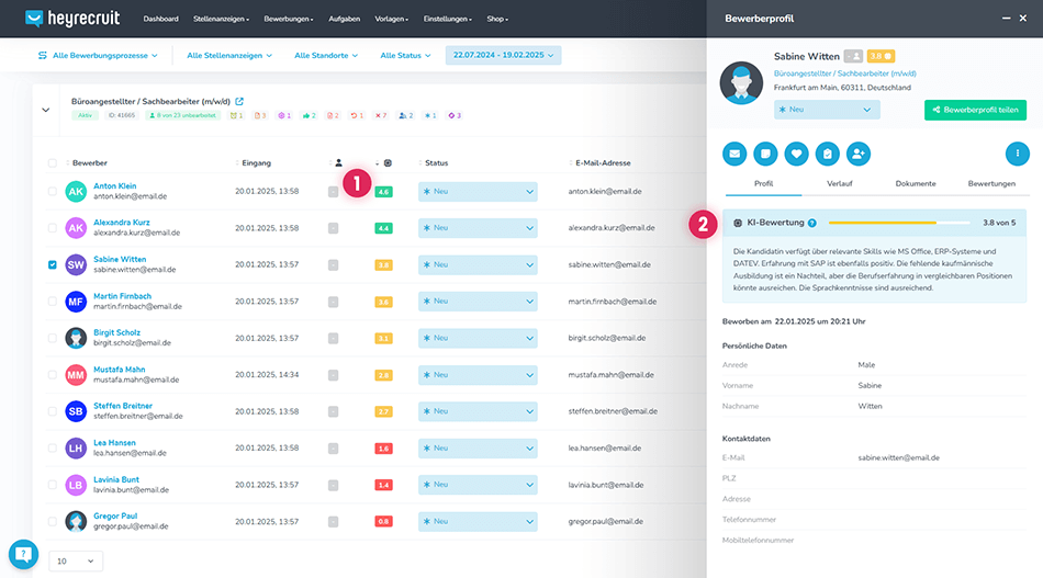 - Sortiere Bewerbungen nach der numerischen Bewertung und prüfe die Analyse-Texte unserer KI.