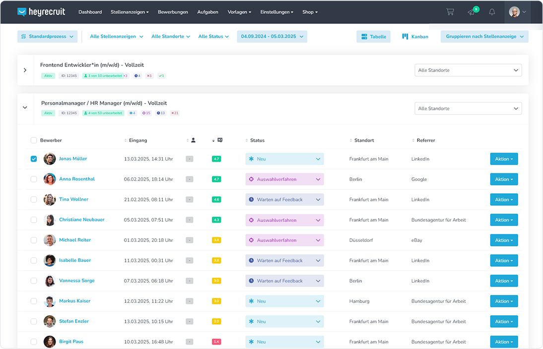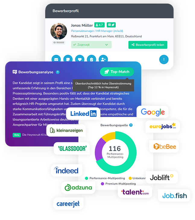 Wenn Recruiting verlässlich liefert, bleibt dein Unternehmen handlungsfähig. Dank integriertem Performance-Multiposting macht Heyrecruit den Bewerbungszufluss planbar und hält alle Prozesse bis zur Einstellung in einem System.