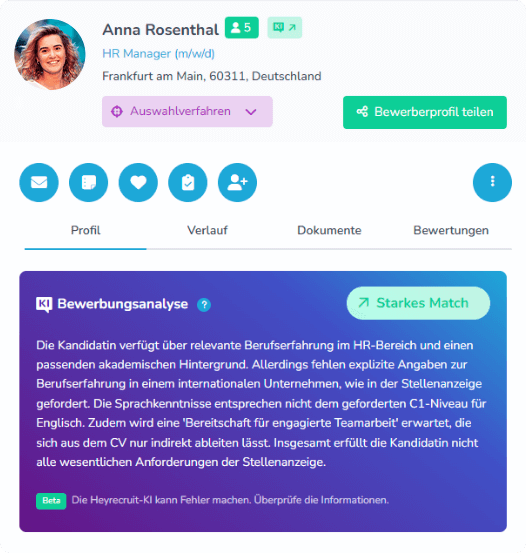 Mit Heyrecruit baust du dir Talentpools für zukünftige Besetzungen auf – sauber und datenschutzkonform. Kandidaten werden per Einladung aufgenommen und bestätigen den Talentpool per E-Mail-Opt-in. Du kannst mehrere Pools anlegen und sie wie Stellenanzeigen steuern: mit eigenen Prozessen, Formularen, Zuständigkeiten, Aufgaben und Team-Zuweisungen. Optional aktivierst du die KI-Analyse, erstellst ein Anforderungsprofil je Pool und bekommst eine klare Priorisierung deiner Talente nach deinen Vorgaben.