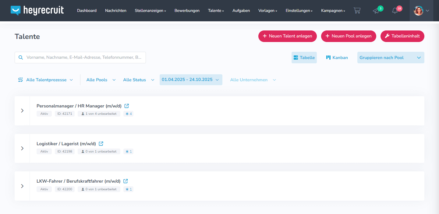 Bestehende Talentpools wurden automatisch migriert und stehen Dir im neuen System weiterhin vollständig zur Verfügung.