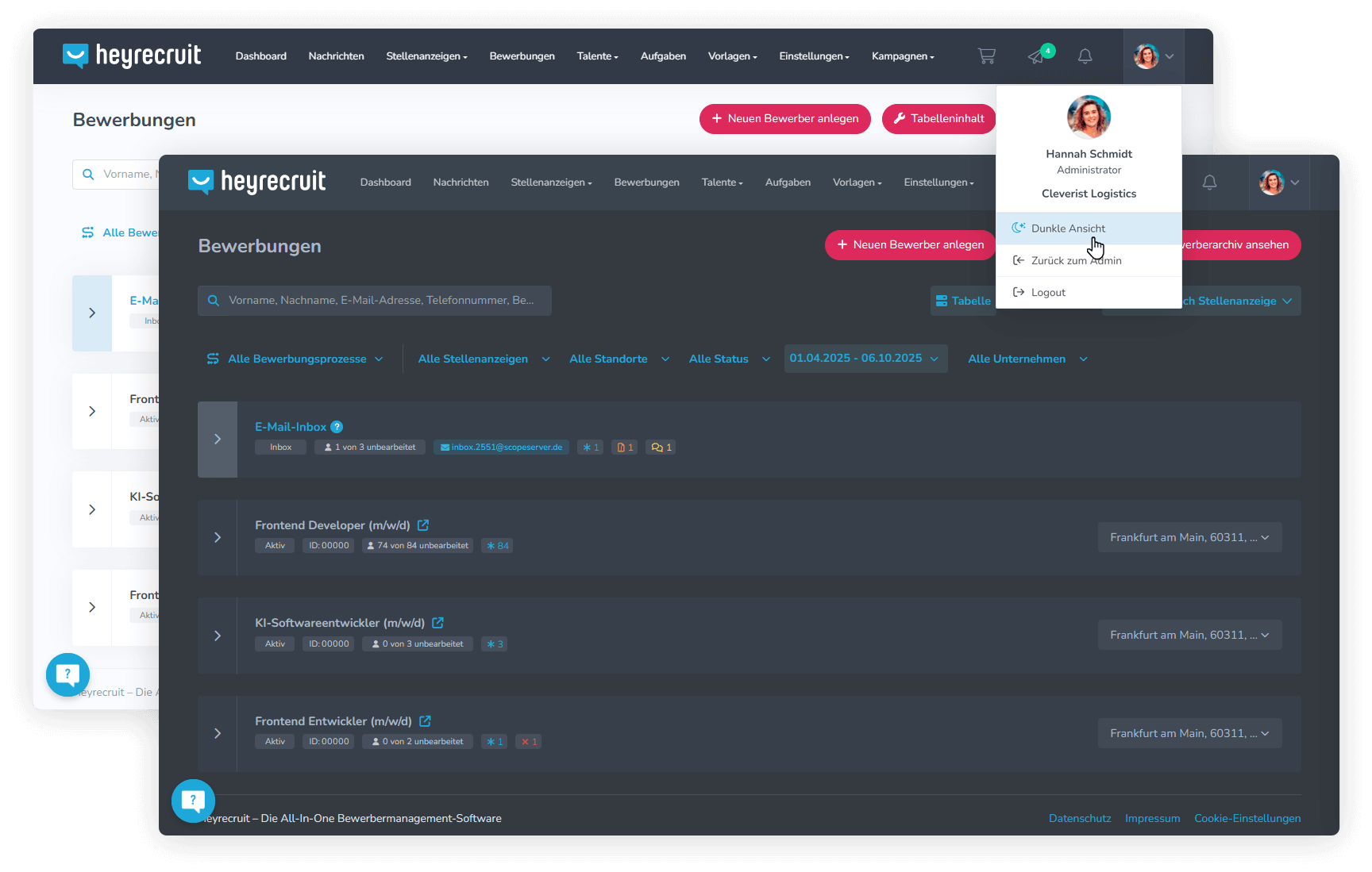 Der neue Dark Mode verbessert das konzentrierte Arbeiten mit Heyrecruit – besonders praktisch bei längeren Screening-Sessions und empfindlichen Augen.