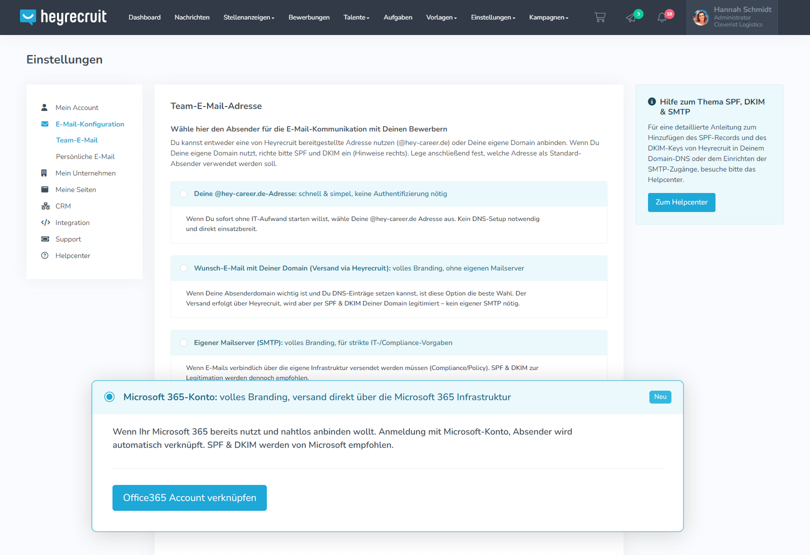 Wenn Dein Unternehmen bereits Microsoft 365 nutzt, kannst Du Deinen Account einfach per oAuth-Dialog anbinden. Dein Absender wird automatisch verknüpft, SPF und DKIM werden von Microsoft empfohlen.