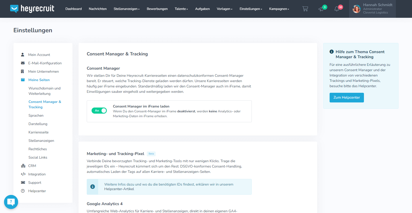Ab sofort kannst Du eigene Marketing- und Tracking-IDs für Google Analytics 4, Google Ads Remarketing, Meta Pixel, LinkedIn Insight Tag und TikTok Pixel in Deinem Account hinterlegen. Diese werden automatisch auf Deinen Stellenanzeigen und Karriereseiten geladen.